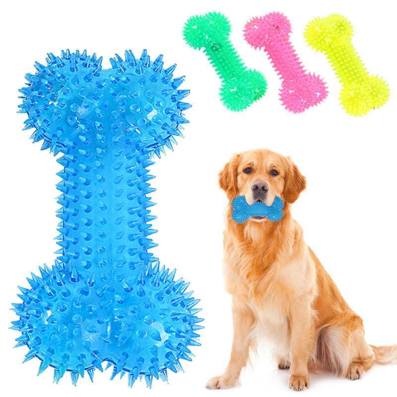 Squeaky Chewing Bone Toy for Dogs with LED light. This is a rubber toy and comes in Blue, Green, and Pink colors and Small and Large sizes.