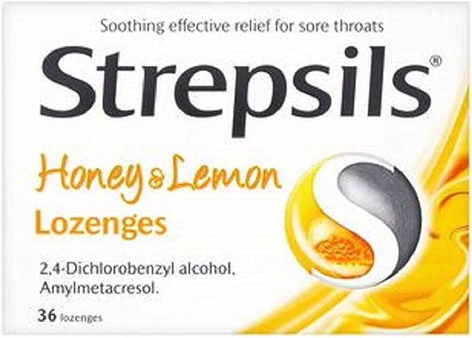 Strepsils Honey & Lemon 36 Lozenges: Strepsils are throat lozenges commonly used to soothe sore throats. The honey and lemon flavor provides a pleasant taste.