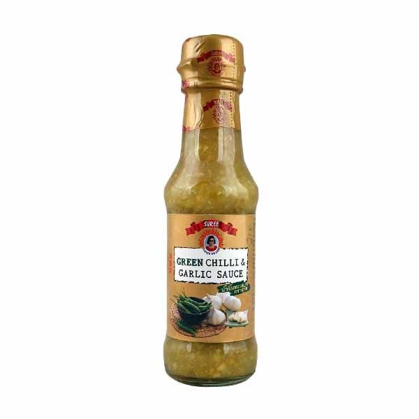 Suree Sauce Green Chili Garlic 150ml Suree Green Chili Garlic Sauce, in a 150ml bottle, combines the freshness of green chilies with the aromatic essence of garlic. This sauce adds a burst of flavor and a hint of spice to your meals.