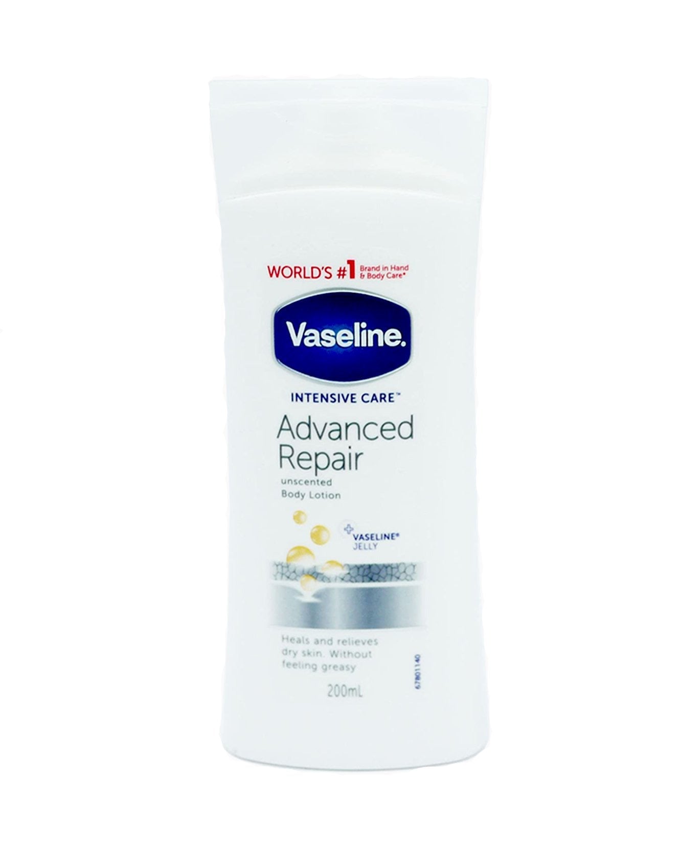 Vaseline Intensive Care Advanced Repair Unscented Body Lotion moisturizes dry skin. Vaseline Advanced Repair Body Lotion can moisturize and repair stubborn dry skin and contains microdroplets of Vaseline Jelly to lock in moisture. Deeply moisturizes to heal dry skin in 5 days. Best for: Daily body lotion for dry skin, sensitive skin, dry irritated skin.