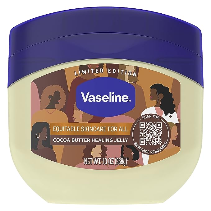 Vaseline Healing Jelly Cocoa Butter locks in moisture to help heal dull, dry, cracked skin with a light cocoa butter scent. Petroleum jelly helps keep your dry or cracked hands and skin healthy-looking and glowing all day. This dry skin moisturizer contains cocoa butter, which is known to nourish your skin. This gentle moisturizer for dry skin is dermatologist-tested and non-comedogenic, so it won't clog pores. This moisturizer for dry skin is made with triple-purified jelly and its purity is guaranteed. This classic skin protectant is great for dull skin and heals dry or cracked skin.