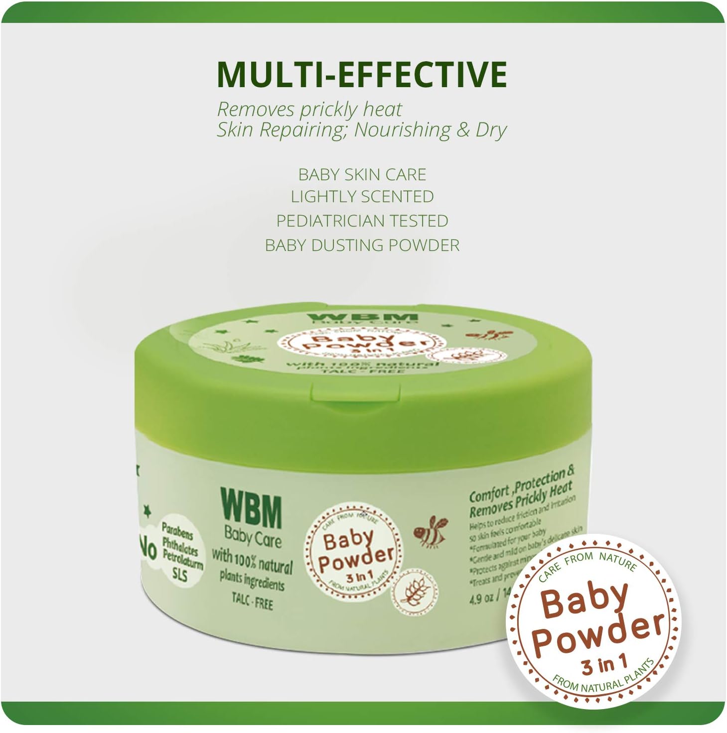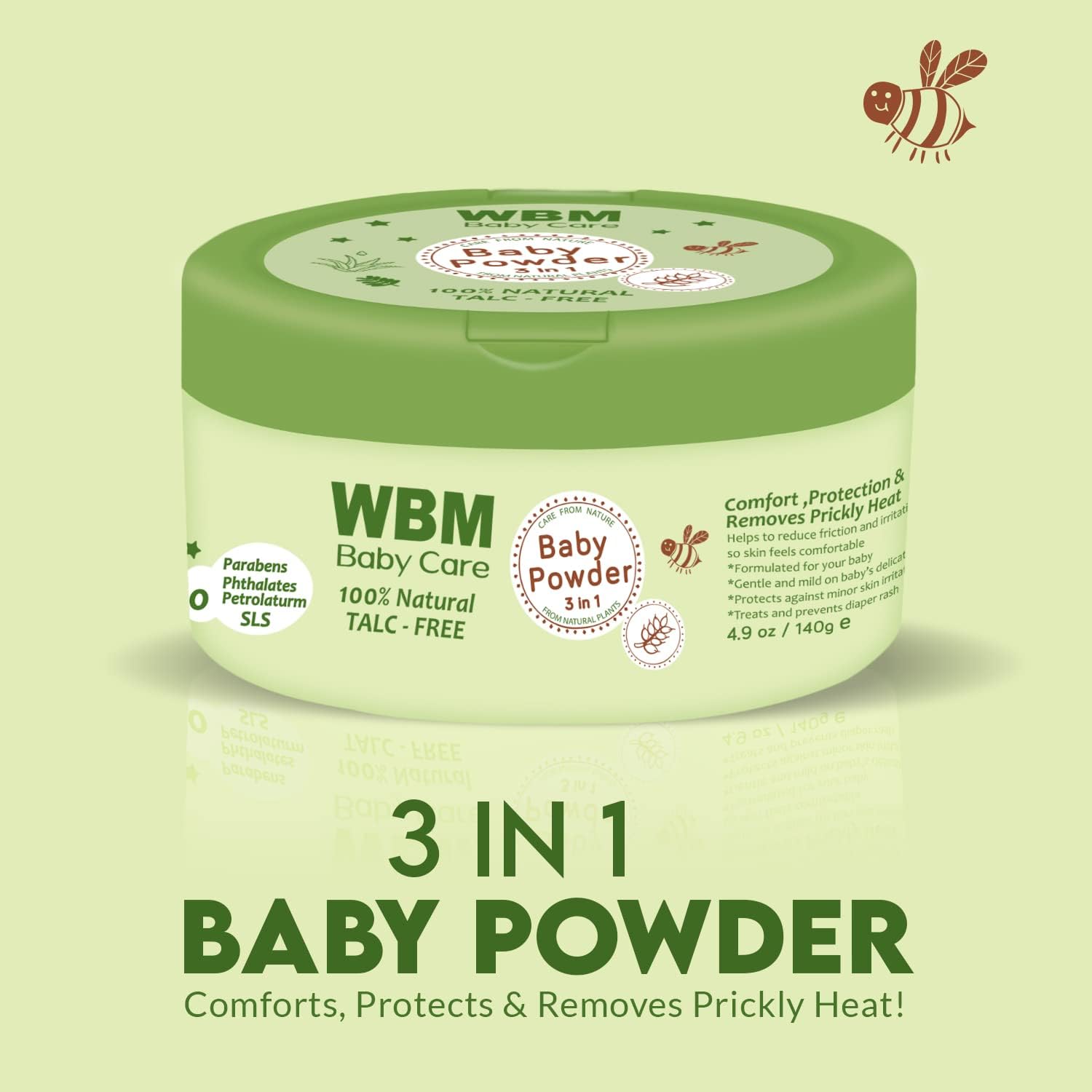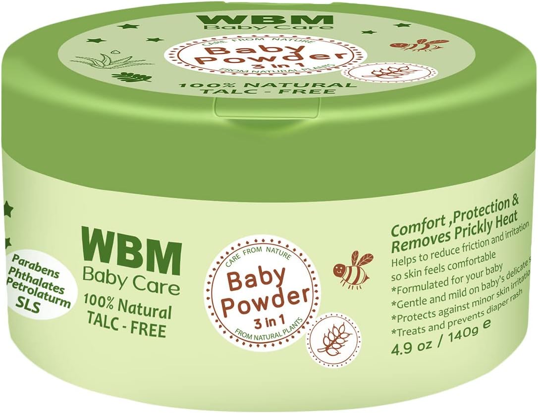 The WBM Baby Powder 3 in 1 is a must-have for parents who want to provide the best care for their little ones. This premium product is made with high-quality ingredients that are gentle on your baby's delicate skin. The 140g pack is perfect for daily use and offers a perfect blend of gentle care, soothing fragrance, and effective protection. Our baby powder is crafted with utmost precision to ensure that it provides a soft and smooth touch, keeping your baby's skin dry and comfortable throughout the day. The hypoallergenic formula guarantees safety and prevents any potential irritation, making it suitable for even the most sensitive skin. The WBM Baby Powder 3 in 1 is also incredibly convenient for on-the-go parents who prioritize their baby's well-being. Its compact size makes it easy to carry in your diaper bag or purse, so you can use it whenever and wherever you need it. Trust WBM for a superior baby care experience. Our commitment to quality and safety ensures that you can use our products with confidence, knowing that your baby is getting the best care possible. Try the WBM Baby Powder 3 in 1 today and see the difference it can make for your little one.