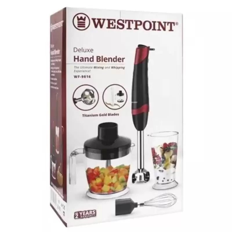The Westpoint WF-9816 3 in 1 Hand Blender is the ideal multipurpose blender for mixing, chopping, and beating. This high-powered hand blender has a powerful motor and long-lasting titanium blades. You can use it to mix ingredients such as ice cream, yogurt, eggs, margarine, oil, and peanut butter, and chop fruit, vegetables, and meat. The Westpoint WF-9816 also has two processing speeds, and it comes with a comfortable grip.